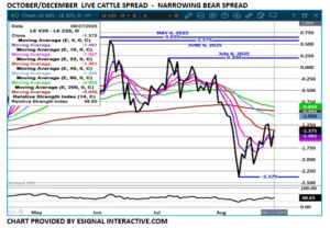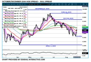 If analysts are correct and pork consumption increases, the bull spread between October and December should widen and lean hogs should gain on live cattle. Live cattle/lean hog spreads are currently at a record extremely wide spreads.