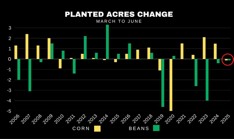 March to June Change in Corn and Bean Acres was the smallest for corn since 2014, and the smallest for beans since 2021.