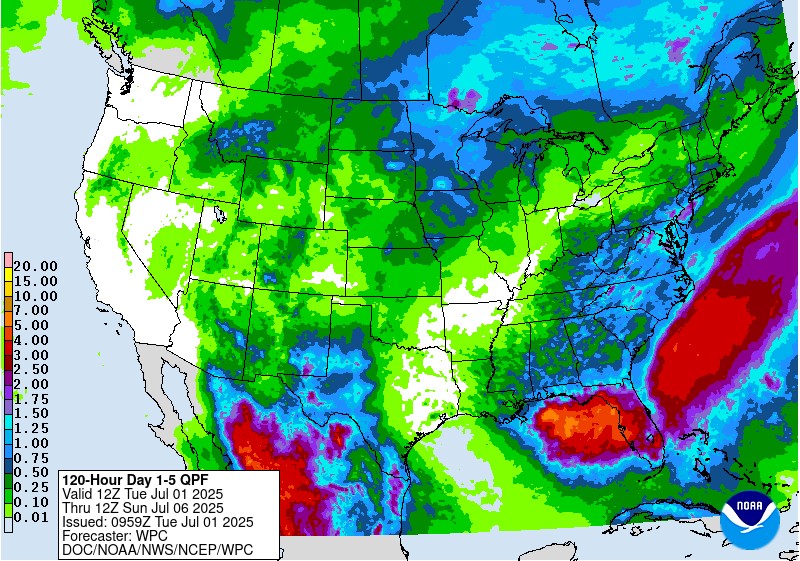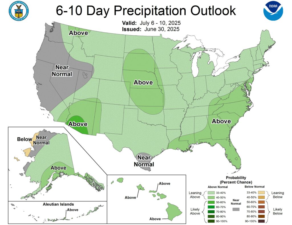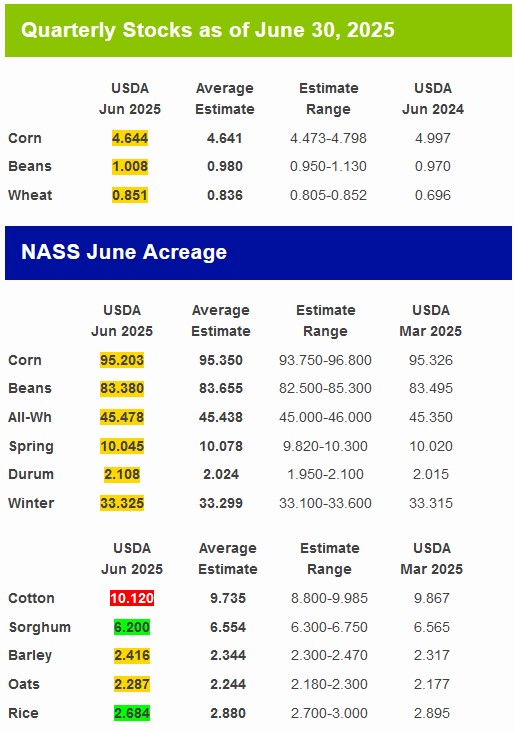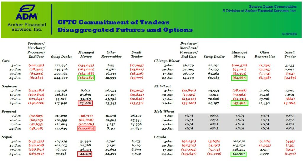 Yesterday’s Stock and Acreage report was mostly uneventful. It was the smallest change to corn acres since 2014, and the smallest for soybeans since 2021. Driving through Minnesota, North Dakota and South Dakota I didn’t see a single field missed. Everything was planted and with a healthy start. In some of the Southern Minnesota areas the low grounds may have received a bit too much rain. Storms that blew through southern North Dakota and Northern South Dakota may have compromised up to 10M bushels of storage which could keep a cap on mid-harvest basis levels and possibly promote carries in the northern cash market. Weather becomes the focus for today’s market, alongside South American harvest. Most of the Midwest will receive about an inch of rain between now and mid July. Northern Illinois and northern Indiana are the only areas with little to no rain in the 7-day forecast. Crop conditions can be seen below and both Illinois and Iowa are both exceeding their average corn conditions at this time of year bey over 10% good/excellent. We are expecting to see July temperatures 1-2 degrees above the 20-year average. I am recalling last year when we saw a very dry last half July, August and September while still producing heavy yields. Considering the resilience of improved agriculture practices, better hybrids, and the current forecast, It is now hard for me to argue the USDA’s current yield projections.