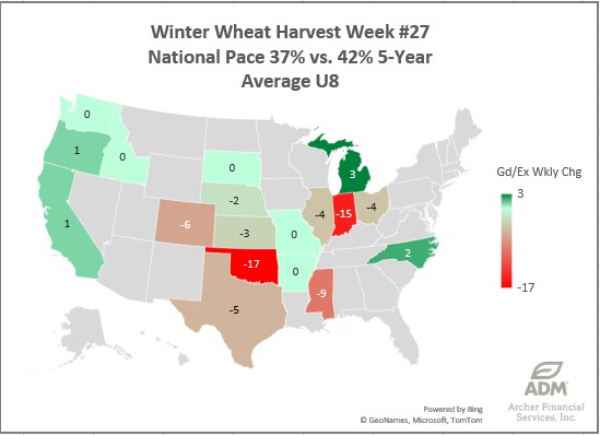 Winter Wheat Harvest progressed +18% to 37% as of yesterday afternoon’s USDA crop progress report. This is about 5% behind the 5-year average harvest pace. Indiana and Oklahoma are the furthest behind.