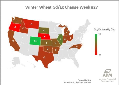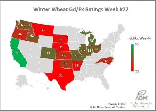 Winter Wheat Crop Conditions were down -1% week-over-week to 48% good/excellent. The PNW and Nebraska were the drivers behind the lower average rating. 48% is below the 5-year average and suggests the USDA needs to drop winter wheat yields at least 1 bu per acre.