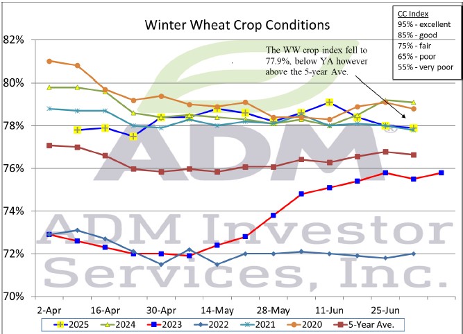 Soybean Crop Conditions held steady at 66% good/excellent. The wheat belt improved while beans in Illinois dropped -7% week-over-week.