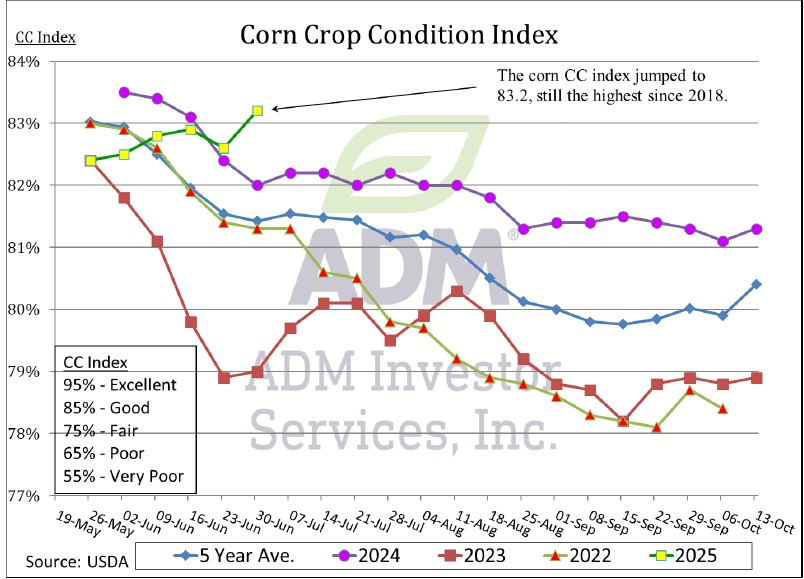 Corn Crop Conditions increased +3% to 73% good/excellent, thanks mostly to the wheat belt. Texas corn ratings popped +15% alone. Check out Iowa at 85% gd/ex, vs 72% Iowa avg. Illinois is also +11% better than Illinois average.