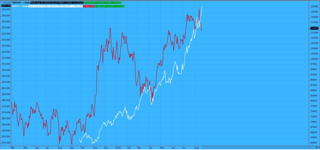 September Feeder Cattle (White) and Bitcoin (Red) Both assets have been on historic runs. I just thought these two charts looked interesting next to each other. Sep Feeder Cattle is up 46% from October lows, while Bitcoin is up 91% in the same time. Folks have been trying to call the highs in both.