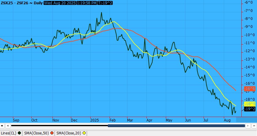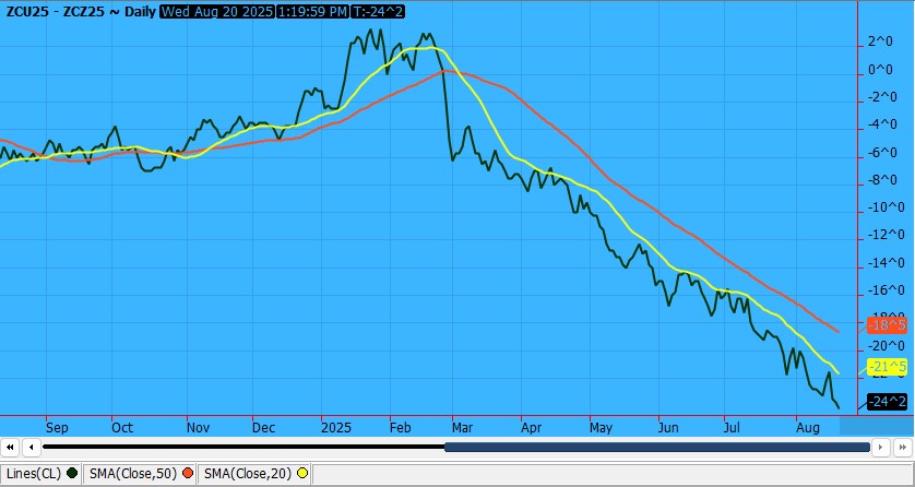 The U5-Z5 Corn Spread (-24¢ carry) Is now stretching down to 80% full carry, using 6.1% interest rate. This is due to both farmers having more than expected old crop and no real threat to early corn harvest pace in the forecast. Corn exports are solid with another 1M bu sale to Mexico yesterday and another 225K MT of corn flashing across this morning to Mexico and Colombia.