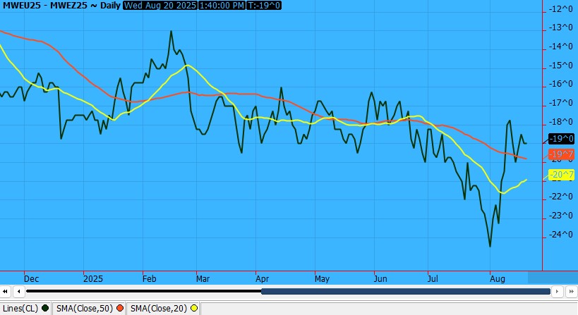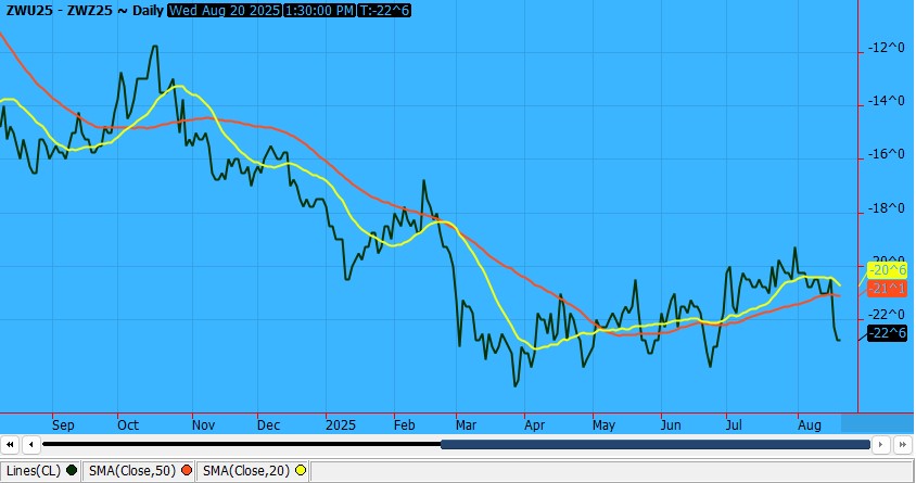 The Minneapolis Wheat U5-Z5 Spread may weaken back out to -22¢ if harvest pace picks back up. North Dakota got another shot of rain on Sunday that slowed farmers down, but they were able to get back out in the fields yesterday and today to regain time. They should not get another douse of rain for at least a week.