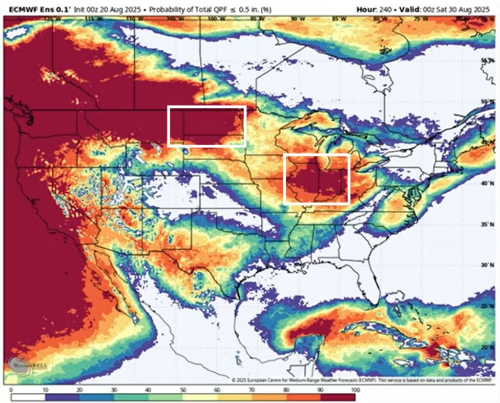 The Probability of Less Than 1/2 inch of Rain will almost certainly be the case within the two white boxes below. So expect producers in these areas to start to talk about dryness and yield drag.