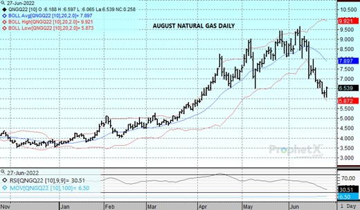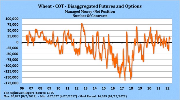 Wheat futures traded higher. WN ended near 11.28 before testing 11.43. KWN ended near 11.88 before testing 11.98. MWN is ended near 11.79 before testing 11.88. Ukraine war continues. This could be pushing wheat higher if Black Sea and EU exports are reduced and Ukraine 2022 winter wheat crop is also reduced. July KC wheat has rallied on a lack of increase in open interest. KWN is not overbought. Tech signals suggest KWN could test 13.60. Weekly US wheat exports were 16 mil bu vs 23 ly. Exports to date are 664 vs 811 ly. Some feel US 2021/22 wheat carryout could be near USDA estimate of 678 mil bu. Some had hoped for higher US exports but US prices are not yet competitive vs EU and Russia. There is a wide range of guesses for US 2022 wheat crop from 1,810 to 1,960 vs USDA 1,910. This suggest a carryout from 450 to 815 versus USDA 731. Trade estimates US winter wheat crop rating near 33 pct G/E vs 32 last week.