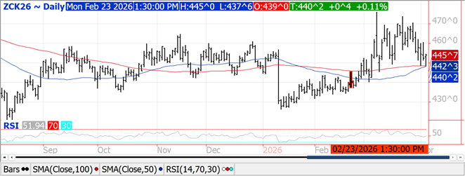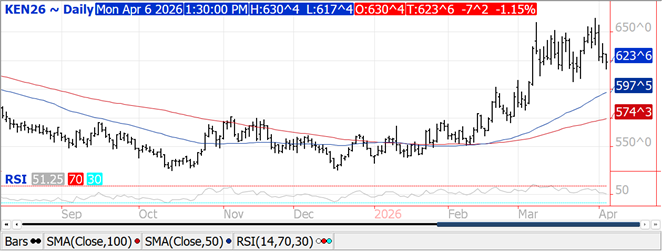 Prices ranged from $.02-$.07 lower with KC futures the downside leader.  Support for July-26 KC is at $6.06 ¾.  US winter wheat acres in drought jumped 8% LW to 65%, a new 52 week high, and well above the 37% from YA.  Winter wheat conditions are expected to land at 42% G/E, vs. 48% YA.  Spring wheat plantings are expected at 2-3%. Across the 3 classes of wheat MM’s were net buyers of nearly 28k contracts, extending their combined long position to 51,314 contracts, the largest since June-22.  MM’s were net long CGO wheat for the first time since July-22.  The United Nations FAO forecasts global wheat production will slip 1.7% in 2026 to 820 mil. tons. Ukrainian drone strikes sank a Russian vessel carrying wheat in the Sea of Azov over the weekend.  The Ave. est. in the WSJ polls shows all wheat stocks slipping 10 mil. bu. to 921 mil.