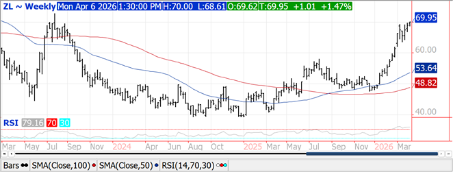 Prices were higher across the complex with beans up $.02-$.03, meal was steady to $2 higher while oil was up 50-1000 points.  May-26 beans have held in $11.55-$11.80 range for the past 3 weeks.  May-26 meal has MA support at $313.30.  Spot bean oil traded $.70 lb. for the first time since July-23.  Bean and meal spreads were mixed while oil spreads surged.  Iran formally rejected a US proposal for a 45-day ceasefire in exchange for an immediate reopening of the Straits of Hormuz.  Iran’s countered with a plan calling for a permanent ceasefire that including the lifting sanctions, compensation for war damages as well as a new arrangement for governing the Straits.  Pres. Trump responded saying Iran’s counter proposal was “not good enough, but it’s a significant step”.  Pres. Trump has also stated he would not move Tuesday’s deadline for Iran to open the Straits of Hormuz or face military strikes on their power plants and bridges.  Crush margins jumped $.11 to $2.99 ¼ bu., a new 3 ½ year high with bean oil PV a new all-time high at 52.5%.  Friday’s CFTC report showed money managers bought just over 13k contracts of bean oil extending their long position to a record large 135,809 contracts.  Across the soybean complex MM’s bought nearly 21k contracts pushing their long position to a record high of 449,149 contracts. Export inspections at 29 mil. bu. were above expectations and above the 20 mil. needed per week to reach the USDA forecast.  Last week’s inspections were revised up by 4 mil. bu. bringing YTD inspections to 1.127 bil. down 26% from YA vs. the USDA forecast of down 16%.  China took nearly 19 mil. bu.  The WSJ poll expects no change to ending stocks of 350 mil. bu.
