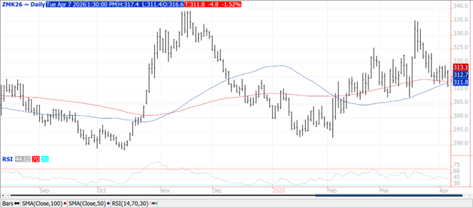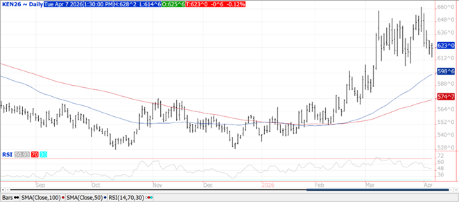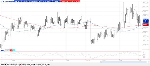 Prices were $.04-$.05 lower as spreads weaken ahead of the Goldman roll that begins tomorrow. May-26 held a challenge of MA support at yesterday’s low of $4.48 ¼. Support for Dec-26 is at last week’s low of $4.76. Plantings as of April 5th reached 3%, just above the YA pace and 5-year Ave. of 2%. The Reuters poll expects virtually no change in US ending stocks in Thurs. USDA WASDE update, holding near the Mch-26 forecast of 2.127 bil. US corn remains competitively priced in the global marketplace. Tomorrow’s EIA report is expected to show ethanol production rose to 320 mil. gallons LW, up from 316 mil. the previous week. Also little change expected for global stocks. EU imports as of April 5th at 13.58 mmt are down 18% YOY.
