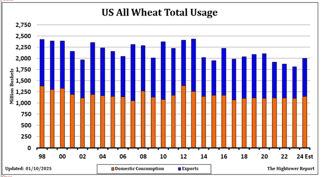 Prices were up $.03-$.05 across all 3 classes today. With little fresh news to drive prices trade appeared to be technically driven. Jordan passed while making no purchase on their recent 120 mt tender for hard milling wheat. Russia’s Ag. Minister was quoted as saying they maintain their grain production forecast of 132 mmt with wheat accounting for 86 mmt. SovEcon raised their Russian wheat production forecast .4 mmt to 83.3 mmt, very near the USDA forecast of 83 mmt. Kazakhstan’s Ag Ministry states they could supply up to 3 mmt of wheat annually to China, above their current agreement to ship 2 mmt. Much of Ukraine and southern Russia will remain in a hot/dry pattern for at least the next week. US winter wheat harvest is winding down at 96%. Spring wheat ratings improved 1% to 73% G/E vs. expectations for a slight decline. 31% of the crop is harvested, slightly behind the historical average. EU soft wheat exports at 3.55 mmt are down 22% from YA.