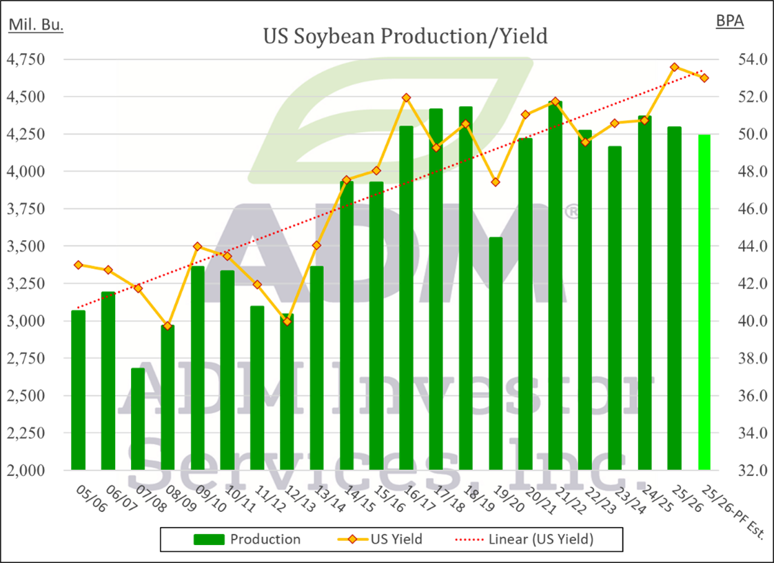Prices were mixed with beans up $.02-$.03, meal was steady to $3 lower while oil closed 120-145 points higher. Meal spreads continue to surge as hand-to-mouth buyers appear to be in short supply. There were net cancellations of another 97 contracts registered for delivery with the CME against soybean meal futures. Nearby bean spreads softened while back months have firmed. Oil spreads weakened on the price surge. Nov-25 beans jumped out to a fresh 2-month with next resistance is at the June high of $10.74 ¼. Sept-25 oil jumped to a new high for the month with next resistance at the July high at 57.64. For now Sept-25 meal rejected trade back above $300 ton. The EPA ruled on 175 petitions (of the roughly 200) seeking relief from the nation’s RFS. Of those petitions considered 63 were granted full exemptions, 77 received partial exemptions (50%), 28 were denied while 7 were determined to be ineligible. The EPA added that refiners that were approved for exemptions had complied with the law and will have RIN credits returned, however credits returned from before 2023 will not be eligible for future compliance obligations. The EPA will return 1.39 bil. in credits for 2023 and 2024 that can be used for future compliance with total exemptions amounting to 5.34 bil. RINS. The EPA will seek public comment on whether larger refiners should make up for the exempted gallons. Still much uncertainty as big oil will surely challenge in court any reallocation effort by the EPA. Spot board crush margins surged another $.11 today to $2.19 ½ bu., a 2 week high, while bean oil PV improved to 48%. While remaining doubtful small refineries experience disproportionate economic hardship due to the RFS they announced they were pleased the EPA was taking a “reasonable approach to the SRE backlog”. Pro Farmer estimates the 2025 soybean crop at 4.246 bil. bu., 46 mil. below the USDA. Their Ave. yield forecast at 53.0 bpa, is still a record high, however below the USDA est. of 53.6 bpa.
