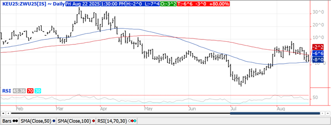 Prices closed within a penny of unchanged in 2 sided trade. Dec-25 held within yesterday’s range. Although Sept/Dec has carved out a fresh low, the spread rebounded late to narrow up $.01 ¼. Overhead resistance for Dec-25 is at the 50 day MA at $4.18 which could be challenged Sunday night with the lower than expected production forecast from PF after today’s close. They est. the US 2025 corn crop at 16.204 bil. bu., 538 mil. below the USDA est. in August. Their average yield forecast at 182.7 bpa is well below the USDA est. of 188.8 bpa. The USDA announced sales of 120k mt (4.7 mil. bu.) to Costa Rica and 140.5k mt (5.5 mil. bu.) to Spain. Heat and drought stress is taking a toll on France’s corn crop where conditions slipped 3% LW to 62% G/E, well below the 76% YA. The BAGE reports Argentine harvest advanced 1% LW to 96% complete while maintaining their production forecast at 49 mmt, vs. the USDA est. of 50 mmt. Cattle on feed as of Aug. 1st at 98% of YA was in line with expectations. Placements at 94% were above expectations of 91% while marketing at 94% were in line with expectations.