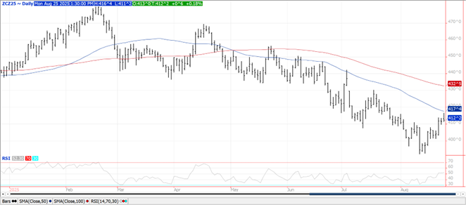 Prices were $.01 higher today in 2 sided trade.  Dec-25 traded to a new high for the month, however stalled out before reaching the 50 day MA resistance at $4.17 ½.  While the Sept/Dec spread narrowed a touch, back spreads softened.  Prices drew support from the lower than expected production forecast on Friday from Pro Farmer.  They est. US corn production at 16.204 bil. bu. down 538 mil. from the USDA est. in Aug.  Their yield at 182.7 bpa, while still a record high, is well below the USDA forecast of 188.8 bpa.  Export inspections bounced back to 51 mil. bu., in line with expectations.  YTD inspections at 2.738 bil. are up 28% from YA, vs. the USDA forecast of up 25%.  Noted buyers were Mexico – 21 mil. and Japan – 15 mil.  Friday’s CFTC report showed MM’s were net buyer of over 31k contracts of corn, reducing their net short position to 145k contracts.  MARS, a European Ag. consulting group, is forecasting 2025 EU corn yields at 6.93 mt/HA, down from last month’s forecast of 7.18 mt/HA and well below the USDA yield estimate of 7.21 mt/HA.  AgRural is reporting Brazil’s 2nd crop harvest has reached 98% while the 1st crop for 25/26 MY is 3.2% planted vs. 4.2% YA.  I’m looking for a 1% drop in crop conditions to 70% G/E.