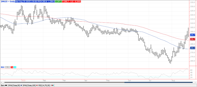 With the exception of Oct-25 soybean meal, prices were lower across the complex.  Beans were down $.07-$.11, meal was within a $1 of unchanged while oil was down 40-50 points.  Spreads were mostly lower across the complex.  Nearby meal spreads weakened after trading to fresh highs in early action.  Meal delivery registrations with the CME were down another 603 contracts from Friday, triggering the initial surge.  Near term resistance for Nov-25 beans is LW’s high at $10.62 ¾ with support at the 100 day MA at $10.27.  Sept-25 meal once again rejected intraday trade over $300 ton.  Inside trade for Sept-25 oil.  Spot crush margins firmed up $.03 to $2.22 ½ per bu. while soybean oil PV held steady at 48%.  US/Chinese trade tensions flared up over the weekend as China’s ambassador to the US stated US protectionism is rampant, casting a shadow over US/China cooperation.  He also suggested the US farmer should not bear the cost of a trade war.  Today Pres. Trump stated China must give us magnets, or risk facing 200% tariffs.  He also claimed Chinese leader Xi wants him to come to China.  Export inspections at 14 mil. bu. were in line with expectations.  YTD inspections at 1.811 bil. are up 11.5% from YA, vs. the USDA forecast of up 10.6%.  MM’s were net buyers of just over 35k contracts of soybeans, just over 24k contracts of meal while net sellers of 13k bean oil.  Something big oil will likely challenge in court.