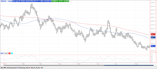 Prices ranged from $.01 lower in spot KC to $.02 ½ higher in CGO and MIAX futures.  Spreads were mixed.  US weather remains crop friendly with much of the Midwest remaining cool and dry the last week of Aug.  Rains this week of 1-3” are expected to stretch across the central plains south and east into the Delta and Gulf coast region.  Export inspections at 35 mil. bu. were well above expectations of 12-20 mil. and the highest in years.  YTD inspections at 212 mil. are up 11% from YA, vs. the USDA forecast of up 6%.  IKAR is reporting Russia’s export price for wheat ended last week at $235/mt FOB, down $3.50 from the previous week.  They attributed the price weakness to light demand from importers and seasonal supply pressure.  MARS estimates EU soft wheat yields at 6.15 mt/HA, up from last month’s forecast of 6.09 mt/HA.  Pres. Trump this AM stated Putin and Zelensky should meet while claiming there will be consequences for Russia if they don’t.  He mentioned he’d give it another week or 2 before stepping in.  MM’s were net seller of nearly 9k contracts of CGO wheat while selling roughly 1k in KC and MIAX combined.