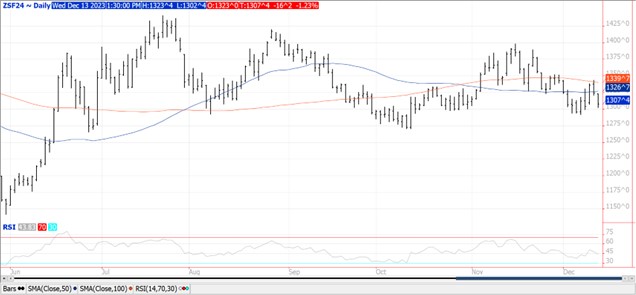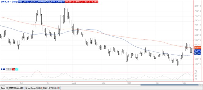 Prices were sharply lower across all 3 classes as the day to day choppiness continues. Chicago and MGEX were down $.15 – $.20, while KC plunged $.22 – $.25. Mch-24 Chicago closed below yesterday’s low, however held above the 50 day MA support at $6.00 ¼. Mch-24 KC briefly traded below this week’s low of $6.30 ¼. Algeria reportedly bought over 900k mt of milling wheat at around $273/mt CF, likely sourced from the Black Sea region for Feb/Mch-24 shipment. Since July 1st Ukraine has exported 6.3 mmt of wheat, down 15% from YA. Ukrainian officials are optimistic total exports in Dec-23 can reach 5 mmt up from 3.8 in Nov-23 utilizing the humanitarian corridor. The US southern plains is receiving a healthy dose of rain midweek helping build moisture reserves for the US winter wheat crop. Export sales tomorrow are expected to range from 44 – 58 mil. bu. reflective of last week’s large announced sales to China.