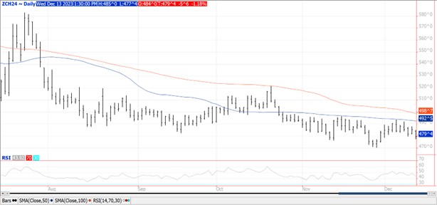 Prices were down $.04 – $.06 today. Ag. markets were today pressured by Argentina’s announced economic policy changes and growing confidence in a more favorable long range forecast in South America. The Argentina Govt. plans to slash government spending, reduce energy and transportation subsidies while devaluing the peso to 800 per US $$, from the current 365. They also announced they’d work toward eliminating export taxes, something that may prove difficult as that would require a vote from Congress. Resistance for Mch-24 rests just above the market at the 50 day MA at $4.92 ½, followed by the 100 day MA at $4.99. Support is at the Nov-23 low at $4.70. No export announcements today. Ethanol production slipped to 1,074 tbd last week, above expectations and well above the pace needed to reach the USDA usage forecast of 5.325 bil. bu. Given the recent uptick in production with a decision on corn based ethanol possibly qualifying for tax subsidies for SAF later this week, bulls remain hopeful for higher corn usage heading into 2024 despite the recent margin pullback. Gasoline consumption rose 4.6% last week to 8.859 mil. barrels per day, and was up 7.3% YOY. Before eliminating export taxes there is the potential for Argentina to raise their export tax on grains to 15% from the current 12%. Brazil’s corn exports are seen reaching 7.14 mmt in Dec-23, down from 7.4 mmt in Nov-23 however a record high for the month. Since July 1st Ukraine has exported 7.4 mmt of corn, down 32% from YA. Export sales tomorrow are expected to range from 30 – 65 mil. bu.