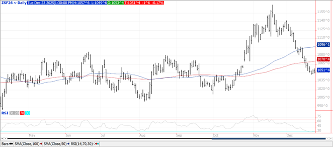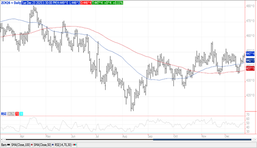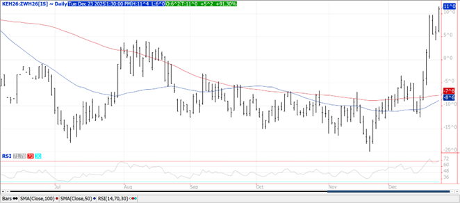 Prices ranges from steady in MIAX to $.06 higher in KC. KC Mch-26 spread over CGO Mch-26 is back over $.10 bu., $.30 off the lows from last month. Spreads firmed in both KC and CGO. Mch-26 KC topped out right at its 100 day MA at $5.29 ¾. Mch-26 CGO made a new high for the week in late trade. Export sales at 16 mil. bu. brought YTD commitments to 726 mil. bu. up 22% from YA, vs. the USDA forecast of up 9%. By class commitments vs. the USDA forecast are: HRW up 90% vs. USDA up 49%, SRW up 11% vs. up 2.6%, HRS down 8% in line with USDA, and white up 6% vs. down 10%. EU soft wheat exports as of Dec. 21st at 10.8 mmt are down 2% YOY. Jordan passed on making a wheat purchase in their recent tender for 120k mt.