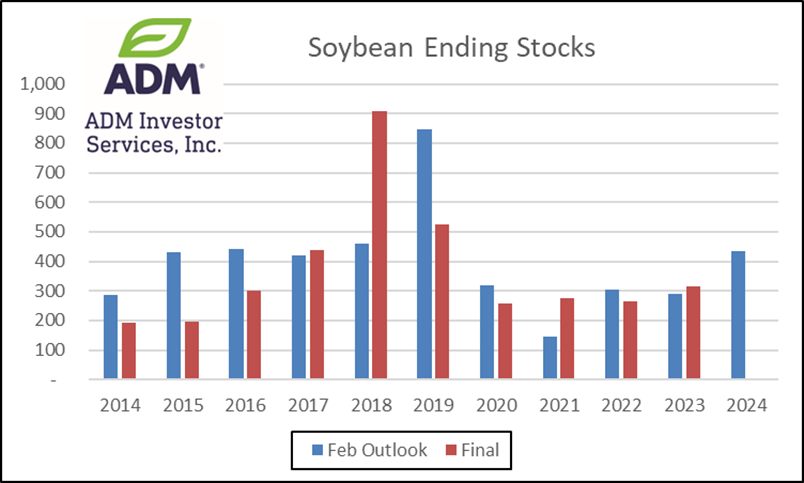 Prices ranged from down $.01 in spot Mch-24 to up $.02 in new crop contracts. Old crop reaching fresh contract lows for 7th time in the last 8 trading sessions. Next support for Mch-24 is at $4.09. Weekly export sales have held up nicely despite the lack of daily announcements and Argentine corn priced slightly below the US thru the Spring months. Argentine crop ratings as reported by the BAGE actually fell this past week despite recent shower activity. 27% of their crop was reported as G/E, down 4% from LW, while 17% was poor/VP up 2% for the week. Still much better than YA when only 11% was G/E and 45% poor/VP. Safras & Mercado lowered their Brazilian production forecast by 10% to 125.9 mmt, which is still among the highest estimates, above the USDA at 124 mmt and well above Conab at 113.7 mmt. Huge variations in Brazilian production forecasts not likely to change real soon with the much larger 2nd crop still being planted. Recent history shows the USDA has a slight tendency to overestimate stocks in the February Outlook. 6 years in the past 10 stocks finished lower than the initial forecast.