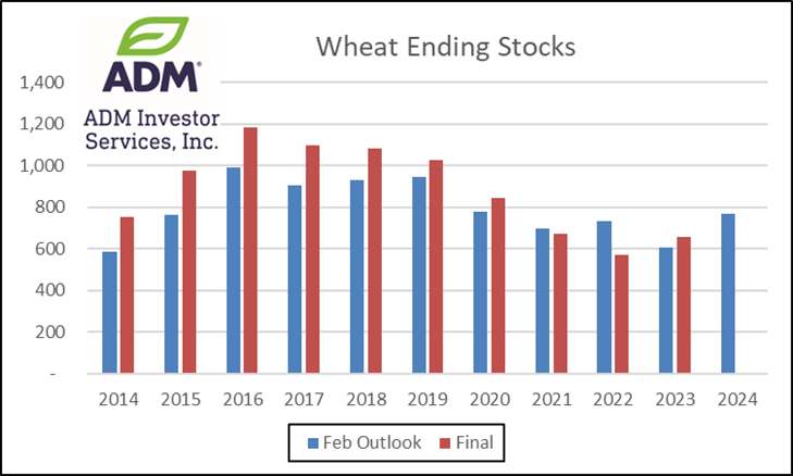 Prices were lower across all 3 classes at today with new contract lows for KC and MGEX. Today’s low for Mch-24 Chicago at $5.56 ¾ held just above contract lows at $5.56 ¼. Despite the recent selloff, US still finds itself $25 – $30/mt above offers from Russia and the Black Sea. Russia’s Ag. Ministry lowered their wheat export tax 2.6% to 3,953 roubles/mt for the period ending Feb. 27th. Little to no rain for the US plain states and WCB over the next week. Temperatures are expected to warm to much above normal readings the last week to 10 days of February for most of the nation’s midsection. Spreads in Chicago continue to firm as exporters are forced to pay up to pry SRW wheat away tightfisted farmers/elevators perhaps needing to start shipments to China. Yesterday’s export sales report showed there are still 60 mil. bu. of outstanding wheat sales to China, with 55 mil. of that SRW. Another 8 mil. SRW are in unknown. IKAR raised their Russian grain production forecast for 2024 to 146 mmt, with 93 mmt of wheat. Their forecast is in line with the 93.6 mmt from SovEcon earlier in the week and just above the USDA forecast of 91 mmt. IKAR also raised their wheat export forecast to 52 mmt, just above the USDA est. of 51 mmt. History shows the USDA has a strong tendency to underestimate stocks in the February Outlook. 8 of the past 10 years stocks finished higher than the initial forecast.