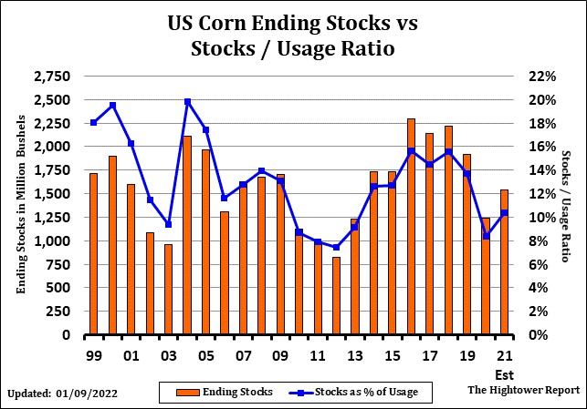 Corn futures ended lower. Managed funds turned sellers after Wednesday higher than expected weekly US ethanol stocks and drop in margins. Most feel supplies will drop once spring and summer driving increase. Corn selling increased after US China Ag attaché dropped their estimate of China 2021/22 corn imports to 20 mmt vs USDA 26. More selling was triggered by USDA announcing China had cancelled 380 mt US corn. Some feel this could be a mistake and could be new soybean sales. Weekly US corn sales were 1,175 mt. Total commit is 45.1 mmt vs 58.5 ly. China commit is near 12.4 mmt. If US Ag attaché is right, US exports are 12 mmt. Ukraine has shipped 7-12 mmt. This suggest China imports are 19-24 mmt or they could be done buying US. Trade estimates Brazil corn crop at 113.6 vs USDA 115 and Argentina at 52.1 vs USDA 54.0. This is only 4 mmt drop. Some could see Brazil closer to 106 and Argentina closer to 40. That would be a 23 mmt drop. The large drop could increase demand for US corn exports. I t could also drop, US 2021/22 corn carryout dangerously low and could prompt a rally in corn prices to encourage US farmers to add acres. Trade estimates US 2021/22 corn carryout at 1,512 mil bu vs USDA January estimate if 1,540.some in the trade are as low as 1,200.
