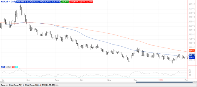 Prices were $.08 – $.11 lower across all 3 classes today, however spot Mch-24 contracts all held above last week’s low. As expected, good rains fell along the US southern plains, gulf coast and delta regions this weekend cutting into drought areas while building moisture reserves for the US winter wheat crop. IKAR reports Russian export prices finished last week at $228/mt on a FOB basis, down $7 from the previous week. SovEcon reports Russia exported 1.3 mmt of grain last week, up from only 830k mt the previous week. Wheat accounted for just over 1 mmt of those grain sales. Ukraine indicates that since Aug-23 they have been able to ship just over 20 mmt of cargo along the “Humanitarian Corridor”. Of this total just over 14 mmt were agricultural goods. Shipments in Jan-24 at 6.3 mmt nearly reached pre-war levels. US export inspections at 10 mil. bu. were in line with expectations however below the 15 mil. bu. needed per week to reach the USDA export forecast. Last week MM’s were net buyers of nearly 5k KC wheat, 3,200 MGEX wheat, and net sellers of 277 contracts of Chicago.