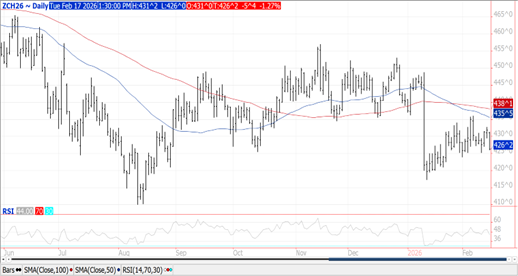 Prices were $.04-$.06 lower as nearby spreads firmed. Mch-26 held support above LW’s low of $4.25 ¼. Spot prices remain rangebound between $4.15-$4.40. AgRural reports Brazil’s 1st crop harvest has reached 22%, lagging the YA pace of 29%. 2nd crop plantings at 31% also trail YA pace of 36%. Friday’s CFTC data showed MM’s bought just over 20k contracts reducing their net short position to 48k contracts. Index funds were net buyers of just over 12k contracts. Export inspections at 59 mil. bu. were above expectations however below the 65 mil. needed to reach the revised USDA forecast. Last week’s inspections were revised up nearly 12 mil. bringing YTD inspections to 1.406 bil. up 44% from YA vs. the USDA forecast of up 16%. Noted buyers were Mexico – 20 mil. and Japan – 12 mil. EU imports for the 25/26 MY as of Feb. 15th at 10.9 mmt are down 17.5% YOY.