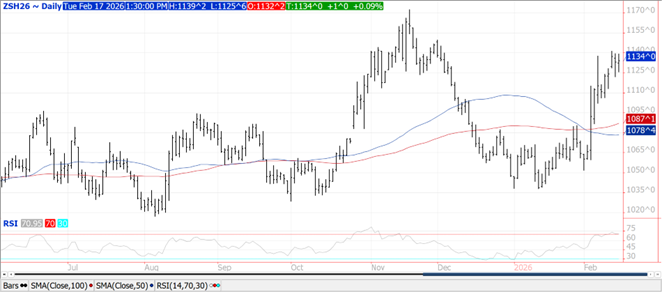 Prices were mixed across the complex with beans steady to $.04 higher, meal was steady to $3 lower while oil ranged from 20-40 points higher in choppy trade. Spreads weakened across the complex. Mch-26 beans hovered just below LW’s high at $11.41 ½. Mch-26 meal held support above its 100 day MA at $304.10. Mch-26 oil hovered just below last week’s contract high at 57.96. Inside trade for both beans and meal. Widespread rains brought temporary relief to central and southern growing areas of Argentina. Rains in Brazil were most heavily concentrated from Southern MGDS thru Parana and into northern RGDS. Scattered rains in northern MGDS and western Mato Grosso. Spot board crush margins fell $.06 to $1.69 bu. with bean oil PV rebounding to 48.4%. NOPA crush from Jan-26 at 221.6 mil. bu. was down from 225 mil. in Dec-25 however just above the Ave. est. of 218 mil. bu. and well above the 200 mil. bu. from Jan-25. NOPA data would suggest census crush at 226 mil. bu. vs. 230 mil. in Dec-25. YTD crush thru the first 5 months of the 25/26 MY would reach 1.118 bil. bu., up 7.2% from YA, vs. the USDA forecast of up 5%. Oil stocks however surged 15.7% from Dec-25 to 1.90 bil. lbs., well above the Ave. est. of 1.668 bil. lbs. and above the range of estimates. AgRural reports Brazilian harvest advanced only 5% LW to 21%, and now below the YA pace of 24%. Harvest in Mato Gross, their largest producing state, saw process hold at 51% still above their long term average of 43%. The 94k contracts of soybeans bought by MM’s in the week ended Tues. Feb. 10th was the largest 1 week total since May-24. Export inspections at 44 mil. bu. were at the high end of expectations and well above the 24 mil. bu. needed per week to reach the USDA forecast. YTD inspections at 895 mil. are down 32% from YA vs. the USDA forecast of down 16%. China took 25 mil. while Egypt took 8 mil. EU soybean imports at 7.94 mmt as of Feb. 15th are down 11% YOY. Meal imports at 11.8 mmt are down 2%.