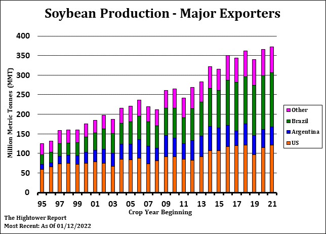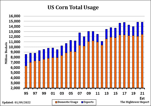 Corn futures ended mixed. CH tested 6.31 on talk of higher US corn export demand due to lower South America supplies and uncertainty over Ukraine exports. Higher demand for US corn could suggest CH testing 6.80. Some have already increased US corn exports to 2,680 and dropped US 2021/22 corn carryout to 1,200. Ukraine still needs to export 19 mmt of corn to reach USDA goal. CH dropped to near 6.20 on talk that US farmer was increasing old crop cash sales. US farmer may be cleaning out bins at current prices. CH trade volume was historically high today. Some feel tech reversal could be a sell signal. A few were asking if US transportation logistics could handle large increase in new export demand. Informa will be out tomorrow with and update of US 2022 planted acres. Informa currently estimates US 2022 corn acres near 91.5 vs 93.3 last year. Some feel CZ needs to trade higher from 5.69 to “buy” more US 2022 acres. Rally in most commodities today especially Crude oil is supportive if Managed fund money is beginning to roll from equites to commodities. Index funds are already near record long grains as a hedge against inflation. Change of futures ownership from commercial long to speculative long suggest volatile swings in prices until more is known about US 2021/22 corn demand and US 2022 corn crop.