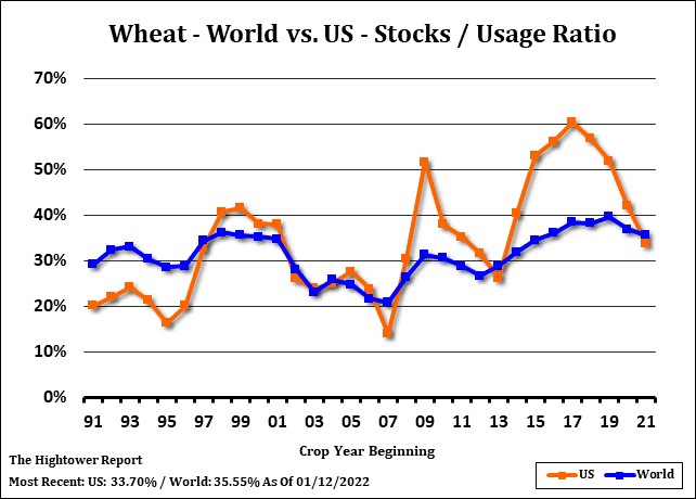 Wheat futures continues to trade higher. Most feel that Wheat futures are adding a geopolitical premium to prices. Threat of Russia invading Ukraine continues to push wheat futures higher. Black Sea is estimated to export another 10 mmt of wheat. USDA dropped US 2022 winter wheat crop ratings. KS is 36 pct G/E vs 39 Jan 3 and 43 ly. CO is 20/25/17. NE 36/39/34. OK 16/20/61. TX 7 vs 29 ly. WH range was 8.00-8.31. WH settled near 8.18. Next resistance is 8.40. KWH range was 8.18- 88.49. KWH settled near 8.47. Next resistance 9.00. MWH ended near 9.47. Range was 9.345-9.65. WN- CN spread is back to near 193. Recent low was 146. Previous high was 264. Informa will be out tomorrow with an update on US 2022 wheat acres. Their current estimate is 49.0 million versus 46.7 last year. Key is Russia Ukraine conflict, Black Sea wheat exports and US spring weather.