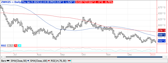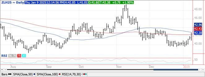 Prices were mixed across the complex with beans $.02-$.03 higher in 2 sided trade. Meal was down $2-$3 while oil was up 80-90 points. Beans spreads were steady while product spreads rebounded. Hot/dry conditions are likely to continue from Central Argentina into Southern Brazil for another week. By late next week and weekend some relief appears likely in the form of scattered showers. Moisture totals of .50-1.0” are likely with some areas picking up 1-2” totals. Midday forecasts however seemed a bit less confident in rainfall coverage than the overnight models. Weakening basis levels in Brazil continue to limit the upside potential. Mch-25 bean oil surged thru its 100 day MA resistance at midday stopping just shy of its 50 day MA at 42.96. Mch-25 meal continues to consolidate near the $300 level and its 50 day MA. Spot board crush margins rebounded $.05 to $1.29 3/4, bu. while bean oil PV jumped to 41.7% a fresh 4 week high. History has shown a bullish bias on January report day for soybeans. Since 2000 spot March futures have closed higher 15 times (60%), while closing lower 10 times. Export sales tomorrow are expected to range from 15-45 mil. bu. for soybeans, 200-400k tons of meal, and 15-50k tons of oil.
