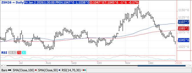 Prices were $.02-$.03 lower in 2 sided trade. Spreads were steady to slightly easier. Mch-26 futures slipped below its 100 day MA however have held support above its December low of $4.35 ½. The $4.35-$4.55 range remains intact. MM’s were net buyers of just over 55k contracts the week ended Dec. 23rd, flipping their position back to long 3k. We’d estimate selling since has likely flipped it back to short roughly 18k contracts. Exports remain strong with commitments up 31% YTD thru Dec. 18th vs. USDA forecast of up 12%. Corn used for the production of ethanol slipped to 472 mil. bu. in Nov-25, in line with expectations. In the Q1 of the 25/26 MY corn usage has reached 1.382 bil. bu., matching the YA total, while the USDA forecast is for a 3% increase.