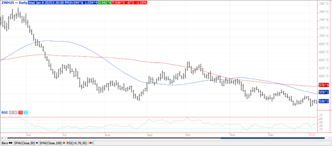 After holding key support levels below the market prices recovered to closed mixed. Chicago finished $.03 higher, MGEX $.03 lower while KC was mixed. Cooler temperatures next week for the Canadian prairies however meaningful rain likely limited to SW regions. Hot/dry conditions to continue for E. Ukraine and S. Russia. Ukraine’s grain exports in July at 3.4 mmt were well above the 2.2 mmt from July-23. Their Ag. Ministries wheat production forecast at 19.8 mmt is still slightly above the USDA est. of 19.5 mmt. Favorable weather has raised Australia’s wheat production potential to as high as 30 mmt, up from 26 mmt YA and the current USDA 24/25 production est. of 29 mmt. Export sales tomorrow are expected to range from 8 – 22 mil. bu