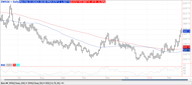 Prices were mixed ranging from $.02 lower in KC to $.04 higher in CGO. Nearby spreads weakened ahead of FND on Monday for the July contracts. Nearby KC spreads collapsed to new lows. Inside trade for Sept-25 CGO with resistance at the 50 day MA at $5.53. Sept-25 KC slipped to a 6 week low. Wheat areas in Australia and Argentina are in need of rain. Dry conditions in Argentina have enabled plantings to reach 73%, slightly behind YA however ahead of the historical average. Much better progress for winter wheat harvest here in the US this week. After 5 weeks of short covering speculative traders have turned net sellers again for the past 5 sessions. Stats Canada reports all wheat acres at 26.925 mil., down from 27.475 in March. Spring wheat acres at 18.809 mil. were down from 19.4 mil. in March and below expectations of 19.2 mil. Durum acres at 6.532 mil. were above expectations of 6.3 mi. The USDA lowered WW acres in the June report 5 of the last 6 years.