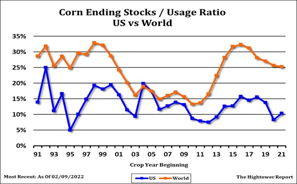 May corn futures ended up the daily limit and near 7.25. Synthetic markets were trading near 7.29 on the close. Last week CK tested 7.16. US farmers were active sellers of cash corn especially new crop last week. New selling was limited today. Some warn that corn futures are getting overbought and vulnerable for wild price swings. Some would not rule out limit down moves if funds want to take profits. Russia continues to invade Ukraine. Ukraine continues to fight. Large Russia military force is heading for Ukraine capital. Russia and Ukraine grain export ports are closed. Some open Black Sea grain sales are being washed out. There is also talk of some Ukraine corn sales being switched to US. Market becoming concerned that a prolong Ukraine War could delay plantings of their 2022 corn and barley crops. Destruction of rail and bridges could also limit grain to ports once the War is over. There is talk that non China corn shorts may be looking to buy 200-300 mil bu US corn. China may be waiting until they need the corn. Some now estimate 64 pct of the Brazil 2nd corn crop is planted vs 39 last year. Central Brazil forecast is warm and dry. Some estimates of the corn crop is now closer to 106 mmt vs USDA 114. USDA estimates US 2021/22 corn exports near 2,425 mil bu vs 2,753 ly. Some analyst could see exports closer to 2,650 which would suggest a carryout closer to 1,220 than USDA 1,540.