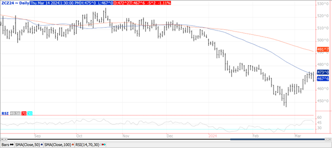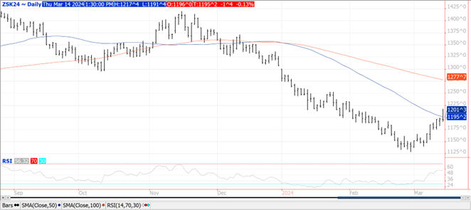 Prices were not able to hold early strength as the soybean complex closed mixed. Beans were within $.02 with bear spreading noted, meal $1 higher, while oil was 15 – 20 lower. May-24 beans surged above the $12 level and its 50 day MA before pulling back. May-24 meal traded to a 3 week high before drifting back to near steady. May-24 oil surged to a 2 month high, trading thru resistance at its 100 day MA at 48.72. Heat and dryness will continue to impact areas of west central and interior south Brazil thru early next week before rains are expected to bring relief by late next week. Additional moisture will be needed thru April to support their 2nd corn crop. Export sales at 17 mil. bu. were at the low end of expectations. YTD commitments at 1.457 bil. are down 20% from YA, vs. the USDA forecast of down 14%. Soybean meal sales at 210k tons were also at the low end of expectations. YTD commitments are up 19% from YA, vs. the revised USDA forecast of up 8%. Bean oil exports at 11k tons were in line with expectations with YTD commitments now up 15% from YA vs. the USDA est. of down 21%. The recent surge in oil exports reflects how US BO prices have become more competitive in the global veg. oil market. The Rosario Grain Exchange raised its Argentine production forecast .5 mmt to 50 mmt, matching the USDA forecast. AgroConsults lowered their Brazilian production forecast 1.6 mmt to 152.2 mmt, just below the USDA est. of 155 mmt, however above Conab’s forecast of 146.8 mmt. Today’s US drought monitor showed 33% of the US soybean area in drought, up 2% from LW. Tomorrow’s NOPA crush is expected to members crushed 178 mil. bu. in Feb-24, down from 185.8 mil. in January, due to few # of days. This however would be well above the previous record for Feb. at 166.3 mil. bu. from 2020. Oil stocks are expected to build to 1.591 bil. lbs. up from 1.507 at the end of Jan-24.