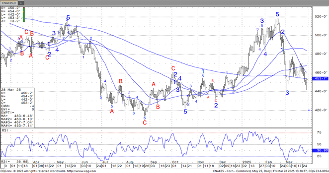 Corn futures rallied late and ended near 4.53. This weeks range was a high near 4.60 and todays low near 4.42. US and Brazil farmers have slowed cash sales which is supporting cash basis. Season to date US corn exports are near 2,089 mil bu vs 1,689 last year. USDA goal is 2,450 vs 2,292 ly. Trade may have priced in at todays low fact USDA will show next week US 2025 corn cres higher than last year. Bears fear CN could eventually trade below 4.00 id acres are higher than last year and US summer weather is normal. There were a few concerned about increase in US west Midwest dry topsoils and wet US east. Delta and SE soils. Headline trading continues due to uncertainty of US tariffs on Canada, Mexico, EU, Japan and China and those countries retaliation.