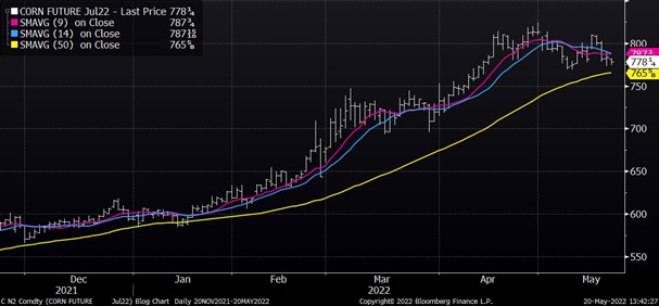 July corn closed moderately lower on the session but has stayed inside of yesterday’s range. December corn also closed lower on the day as the five day forecast is wide open for the Dakotas, Nebraska, Minnesota and Iowa. The market closed 16 ¾ cents lower for the week. Argentina raised its export quota to 35 million tons from 30 million currently. However, the USDA sees exports at 39 million tons for the 21/22 season. Demand remains firm but traders see the weather as a bearish factor.