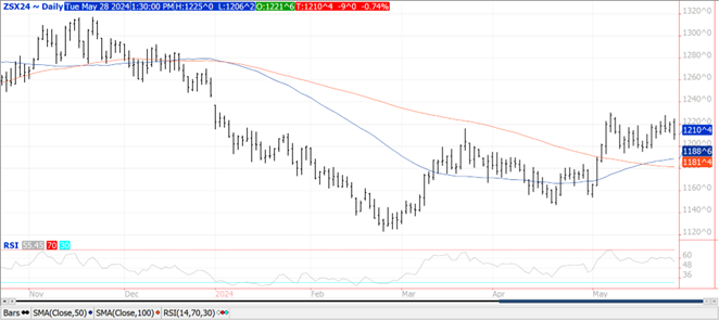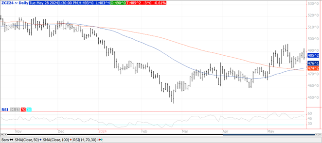 The soybean complex was mixed with beans up $.15 – $.17, meal was $2 – $8 lower with bear spreading noted, while oil surged 140 – 190.  Jan-24 beans traded above the 100 day MA resistance, however held below $13.50.  South American weather continues to be a bit of a mixed bag.  Net drying is expected to occur across the northern growing regions of Brazil thru the end of the week, however rains next week and into week 2 of December are expected to bring needed relief.  Southern Brazil remains in a wetter than normal pattern with moderate the heavy precipitation every 3-4 days.  Argentina is expected to see a good mix of rain and sunshine the next few weeks also bringing relief to recent dry pockets that have developed in the west and southern growing areas.  The USDA announced the sale of 123k mt (4.5 mil. bu.) of soybeans to an unknown buyer.  Last week MM’s were net sellers of just over 6k contracts of soybeans, net buyers of nearly 3,800 oil and 6,400 meal.  The MM long position in soybean meal has swelled to 137,803 contracts, the largest since Mch-2023.  As of Nov. 26th the EU has imported 4.44 mmt of soybeans, up 2% from YA.  EU soybean meal imports have reached 5.96 mmt, down 11% from YA.  The EIA Monthly Energy Review today showed combined biodiesel and renewable diesel production reached a record 411 mil. gallons in Aug-23, up 6.5% from July and up 45% from Aug-22.  While these figures weren’t news to the market, it did provide a reminder of the rapid expansion of renewable diesel industry.  Production reached 85% of capacity in Aug-23, up from 80% in July.  Conab estimates Brazilian soybean plantings at 75%, vs. close to AgRural estimate of 74%.