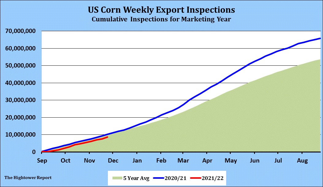 Wheat futures ended mixed. WZ ended near 8.07. Range was 8.05-8.40. KWZ ended near 8.54. Range was 8.47-8.82. WZ and KWZ started higher on talk that Fridays selloff was overdone. There was also hope that new South Africa virus may not be as bad as feared. Fact that Australia raised there wheat, barley and canola crops estimates weighed on prices. Some fear that as much as 5 mmt of the crop could be rated feed quality due to persistent rains. Russia interior wheat and flour prices continue to trend higher. Bulls still feel lower World supplies and higher trade supports higher prices. US south plains weather remains dry. This week Australia looks drier but showers return next weekend. Weekly US wheat exports were near 9 mil bu vs 19 last year. Season to date exports are near 395 vs 475 last year. Some feel USDA could drop US exports 50 mil bu on their next report. At the same time USDA could drop World supply 2-3 mmt and raise trade 3-5 mmt. USDA est World trade near 203 mmt vs 201 last year and end stocks near 275 vs 287 ly and of which 141 is China.