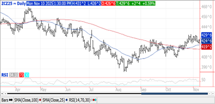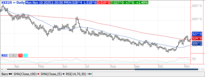 Prices ranged from $.05-$.08 higher across the 3 classes. Spreads were mixed. Inside trade for Dec-25 CGO as it closed just above its 100 day MA. Dec-25 KC closed above Friday’s high and its 100 day MA. Export inspections at 11 mil. bu. were below expectations and below the 15 mil. bu. needed per week to reach the USDA forecast. YTD inspections at 445 mil. bu. are up 19% from YA, vs. the USDA at up 9%. SovEcon expects Russian wheat exports in Nov-25 to reach 4.7 mmt while IKAR expects they will reach between 5.2-5.4 mmt. IKAR also reports Russia’s export price for wheat ended last week at $232/mt, up $1.50 from the previous week. Egypt has reportedly bought 500k mt of wheat recently for Dec/Jan shipment. 200k mt was sourced from Russia, with the balance split between Bulgaria, Romania and Ukraine.