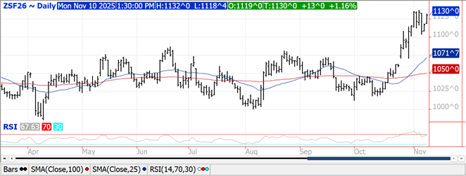 Prices were $.02-$.03 higher in 2 sided trade. Spreads weakened in day 2 of the Goldman roll. Dec-25 rejected trade into new lows for the month with near term resistance at the October high of $4.37. Support below the market is at the 100 day MA at $4.19 ¼. Export inspections at 56 mil. bu. were at the low end of expectations however in line with the 57 mil. needed per week to reach the USDA forecast. YTD inspections at 540 mil. are up 66% from YA vs. the USDA forecast of up 5%. Noted buyers were Mexico – 14 mil. while Korea, Japan and Taiwan each bought between 5 – 7 mil. bu. Wire services are reporting the Ave. estimate for US harvest is 92% vs. the 5-year Ave. of 89% and the 94% pace from YA. AgRural places Brazil’s 1st crop corn plantings at 72% as of late last week, up from 60% the previous week. Safras & Mercado raised their 25/26 Brazilian production forecast 1.1 mmt to 143.6 mmt, well above the USDA est. from September at only 131 mmt. China’s Ag. Ministry raised their countries 2025 production forecast to 300 mmt, vs. the USDA est. of 295 mmt, while also lowering their 25/26 corn import forecast 40% to only 6 mmt. Of course no CFTC update from this past Friday however after buying roughly 2k contracts on Friday we’d estimate the MM short position is roughly 70k contracts.