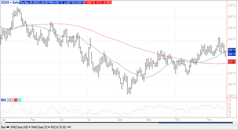 Prices were $.03-$.04 lower in choppy 2 sided trade.  Spreads continue to firm as Dec/Mch traded to a 9 month high at -.10 ¾.  Dec-25 traded into a new low for the month with next support is the 100 day MA at $4.19 ¾.  CFTC data as of Sept.30th showed MM’s short 135k contracts of corn, best guess that is down to 87k at present.  Export sales in the week ended Oct. 2nd at 89 mil. bu. brought YTD commitments to 1.157 bil. up 67% from YA, vs. the current USDA forecast of up 9%.  Using the mid-point of the weekly Ave. estimates over the past 5 weeks would place commitments at a record 1.459 bil. bu. up 24% from YA.  South Korean feed groups have been actively buying global feed corn.  Total volume purchased was reportedly around 330k mt from US, SA or South Africa origin.  The IGC raised their 25/26 global corn production forecast 1 mmt to 1.298 bil. mt’s, 1% above the USDA est. of 1.286 bmt.
