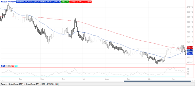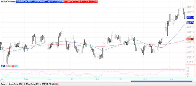 Prices were moderately lower across the complex with several contracts closing near session lows.  Beans were down $.09-$.14, meal was off $3-$5 while oil was down 45 points.  Bean and meal spreads weakened while oil spreads were flat.  Jan-26 beans finished $.47 off this week’s 17 month high.  Support is at this week’s low of $11.14 ¼.  Support for Dec-25 meal is at the 50 day MA at $310.90.  Support for Dec-25 oil also at the 50 day MA at 50.39.  The USDA announced another flash sale of 462k mt (17 mil. bu.) to China bringing this week’s total to 1.584 mmt and just over 1.8 mmt this month, 15% of the 12 mmt the Trump Admin. claims China has agreed to purchase for the 2025/26 MY.  Chinese customs data showed that of their record Oct-25 soybean imports of 9.5 mmt, none had come from the US for a 2nd consecutive month.  7.1 mmt were from Brazil with 1.6 coming from Argentina.  Thru the first 10 months of 2025 total Chinese imports sit at 95.7 mmt with 71 mmt coming from Brazil while only 16.8 from the US.  These totals will begin to start shifting back to the US a bit.  As of Sept. 30th MM’s were net short 39k contracts of soybeans, nearly 118k meal and just over 1k oil.  At present we feel the position in soybeans has flipped to net long 100k contracts, still short 70k contracts of meal and long 14k bean oil.  Soybean sales for the week ended Oct. 2nd at 34 mil. bu. brought YTD commitments to 470 mil. bu. down 36% from YA.  The current USDA forecast at 1.635 bil. bu. is down 13% from YA.  Still no commitments to China as of that week’s data.  How much US soybeans China is willing to buy over cheaper offers from Brazil will go a long way in determining if we have seen prices peak.  While US beans remains competitive with Brazil in the spot FOB market, Brazil’s discount to US by Feb-26 has stretched out to nearly $1 bu.