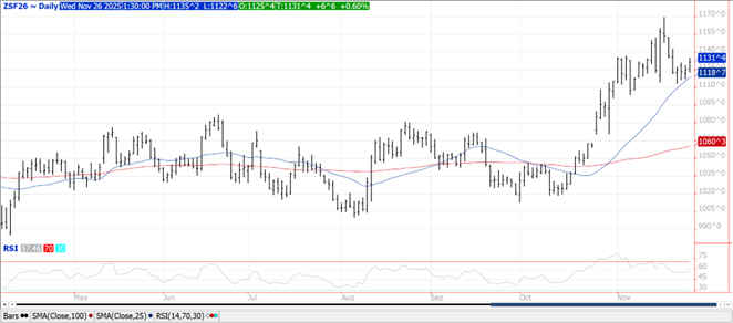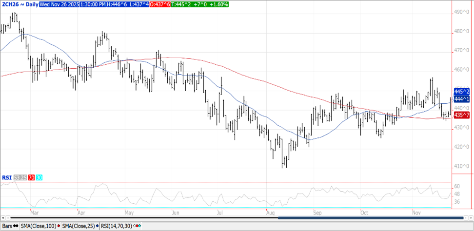 Prices were $.06-$.08 higher with not a whole lot of fundamental news to support today’s price surge. After early weakness spreads firmed with FND on Friday for Dec-25 futures. As of yesterday there were 80 contracts registered with the CME for delivery. Mch-26 corn surged thru its 50 day MA resistance at $4.44. Yesterday’s CFTC data showed that as of Oct. 14th MM’s were holding a net short position of 191k contracts corn, much bigger than expected. Russian attacks on Ukraine’s rail system has limited their ability to export agricultural commodities. As of Nov. 25th their corn exports for the 25/26 MY at 3.12 mmt are less than half of the 7 mmt sold YA. Ethanol production increased to 1,113 tbd, or 327 mil. gallons in the week ended Fri. Nov. 21st up from 321 mil. the previous week, however down .5% from YA. Production was above expectations and well above the pace needed to reach the USDA usage forecast of 5.60 bil. bu. Ethanol stocks slipped to 22.0 mil. barrels, below expectations and below YA at 22.9 mb. Perhaps the corn market is building in expectations for lower production in Jan-26. The historical lean for corn production in January is lower as the USDA has lowered the crop size from the November report 65% of the time over the past 35 years.
