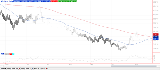 Prices ranged from $.06 lower in spot MIAX to $.05 higher in spot KC futures. Early strength saw new weekly highs for all 3 Mch-26 contracts. Mch-26 CGO has 50 and 100 day MA resistance at $5.47. The higher trade in Mch-26 KC was capped at its 50 day MA. A South Korean feed group bought just over 91k mt of US milling wheat split up between white, HRW and durum. Another S. Korean feed group bought 40k mt of Canadian spring wheat at $260/mt FOB for Mch/April shipment. As of Oct. 14th MM’s were net short nearly 112k contracts of CGO wheat, 68k KC and 29k MIAX. The net short of 208k contracts across the 3 classes was the largest since May-25. Still unclear on where Russia sits with the US supported peace deal.