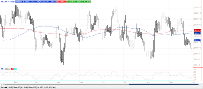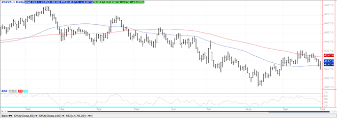 Prices finished $.01 higher in choppy 2 sided trade.  Spreads were mixed and little changed.  Dec-25 closed back above its 50 day MA after trading below the September low overnight.  Prices recovered in sympathy with higher soybeans following Pres. Trumps midday social media posts.  Next support is at $4.00 followed by the contract low at $3.92.  With old crop stocks now well over 1.5 bil. bu., the feed usage forecast from 24/25 MY is likely more than 200 mil. bu. too high.  This lower usage will also carry into the 25/26 MY as well as cattle inventories remain low with the lack of feeders coming in from Mexico due to the screwworm problem.  At this point nobody knows when we’ll get our next production update with the USDA Fed. Govt. on day 1 of the shutdown.  Ethanol production from the EIA which slipped to 292 mil. gallons, down from 301 mil. the previous week and down 2% from YA.  Production the lowest in 4 ½ months and below expectations.  There was 99 mil. bu. of corn used in the production process, or 14.16 mil. bu. per day, well below the 15.4 mbd needed to reach the USDA corn usage estimate of 5.60 bil. bu.  Ethanol stocks slumped to 22.8 mil. barrels, at the low end of expectations and below YA at 23.5 mb.
