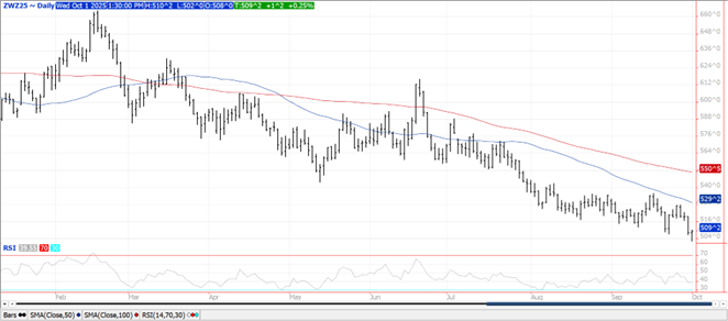 Prices ranged from down $.06 in MIAX to up $.01 in CGO.  New contract lows across the 3 classes on early weakness.  Dec-25 CGO continues to hold support above the $5 level.  Secondary support is at $4.94 ½.  Support for the KC weekly is at $4.80.  Sept 1st wheat stocks at 2.12 bil. bu. was 77 mil. above the average trade guess and largely due to this year’s production increasing 58 mil. bu. to 1.985 bil., 35 mil. above the range of guesses.  The increase largely due to winter wheat acres being revised up nearly 775k, with most of those acres coming from TX and KS.  The percentage of acres harvested for grain rose to 77%, still below YA and historical average of 78%.  The WW yield was little changed at 54.9 bpa, just below the record yield of 55.3 bpa in 2016.  Prior to yesterday report, in the past 15 years, the September report saw production increase only 2 times while being cut 13 times.  Spring wheat production at 497 mil. bu. was also above expectations.